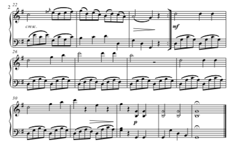 In the development of the Sonatina, from measures 9 to 16, we see the treatment of the main theme. The modifications appear mainly through the augmentation of motifs as scale-like passages, and the entire section is in G Major.