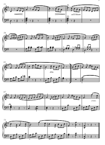 In the recapitulation of section A, there is a full repetition of the first section of the Sonatina in G Major. The final part is the coda, which provides a sense of closure to the piece. The Alberti bass is the dominant feature in the left hand, while the melody is very simple, with a sense of a rhythmic motif that recalls the main motif of the Sonatina. The piece concludes with a perfect cadence.