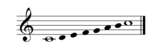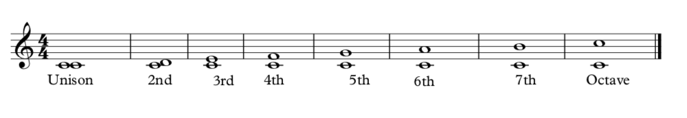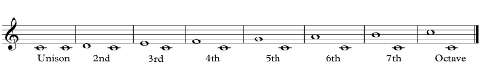 These are the intervals in the C Major scale with the tonic (C) as the reference note. The movement is descending and melodic, meaning the two notes are played one after the other rather than together. The higher-pitched note is played first, followed by the lower-pitched base note (C).”