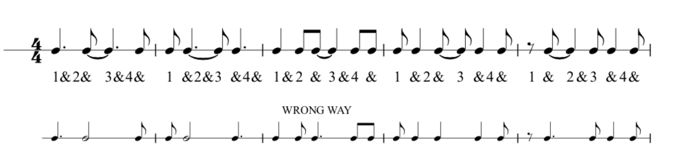 In the picture below, we see measures with rhythmic patterns. The top line shows the correct way to notate some of these patterns using ties, which makes it much easier to keep track of the beats and count each measure accurately. The bottom line shows incorrect notations, where it’s more difficult to interpret the note values without ties. It can be pretty frustrating, can’t it?!