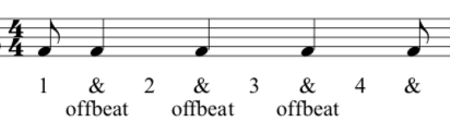 - 1, 2, 3, 4 = downbeats (on the pulse)